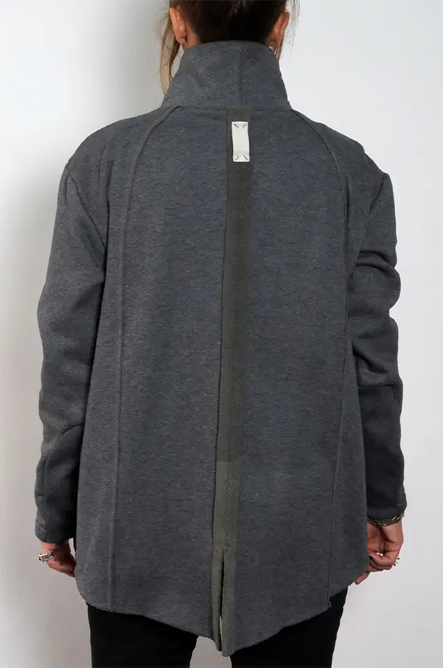 Crafted in a soft, structured fabric, the blouse showcases a distinctive back contour: a bold vertical panel running from collar to hem, creating a striking architectural silhouette. The asymmetrical hem adds movement, while the raw-inspired detailing reinforces the brand’s commitment to process-driven design.