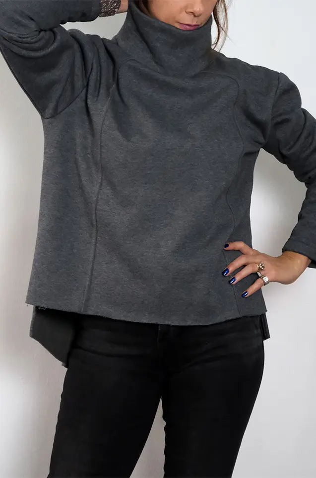 The Contour Squellette blouse reimagines classic tailoring through the lens of deconstructed artistry. Featuring a sculptural turtleneck and elongated sleeves, this piece stands out with its signature externally-outlined “skeleton” seams—a design language central to UNFNISHED’s Sketch to Stitch collection.