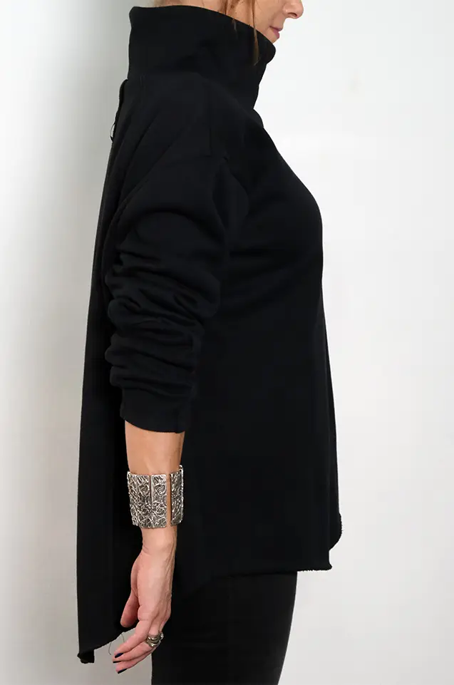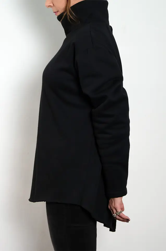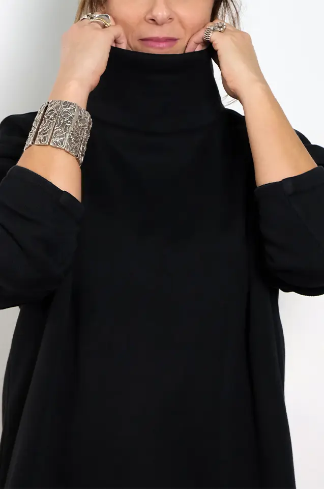 The Edge Neck blouse offers a clean, minimal take on the signature Contour silhouette. Designed with a structured high turtleneck and relaxed long sleeves, it features a smooth, plain finish without external seams. Its soft drape and rounded hem create an effortless everyday piece—simple, modern, and easy to style.